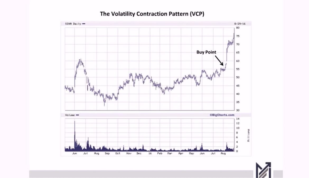 One of the most distinctive aspects of Minervini’s system is his focus on the quality of chart patterns rather than their shape alone. While many traders look for basic formations like cup-and-handle or double bottoms, Minervini looks deeper into how volatility behaves within those structures. One of his key innovations is the identification of the Volatility Contraction Pattern (VCP).